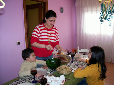 Por fin logramos despedirnos y marché a dormir, no antes sin amenazar de muerte a mis hijos para que no se levantarán antes de las 12 del mediodía de la cama, porque yo no tenía nada que hacer al día siguiente mas que comer, y eso lo podíamos hacer perfectamente después del mediodía. Debo decir que mis amenazas surtieron efecto, porque los peques se despertaron hacia las once y media de la mañana, nos bebimos una taza de chocolate caliente, y poco a poco, fuimos despertándonos. Tocó recoger la casa, tocó darse una ducha de agua calentita para que se nos fuera un poco la cara de trasnoche que teníamos, y finalmente, tocó calentar lo que quedó de la cena de la noche anterior para sentarnos a compartir, en familia, nuestro primer almuerzo del 2010.....